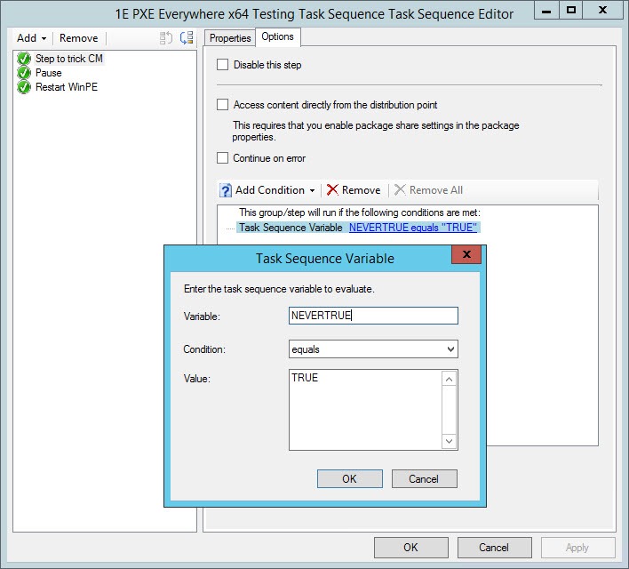 Click on the Options tab in order to create a condition so that the step will always evaluate to false. This can be done by testing for a Task Sequence variable name NEVERTRUE equals TRUE (or if you want to mess with your coworker you can use their NAME equals AWESOME – but just in case they really are awesome you might not want to do this