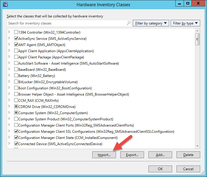 On the Hardware Inventory Classes screen, click the Import button and browse to the location where the UEFI_SECUREBOOT_SMS_DEF.mof file was saved earlier and leave the default selected (Import both hardware inventory classes and hardware inventory class settings) when prompted: