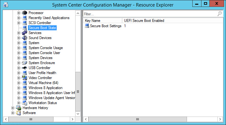 Once systems start processing the new inventory extension, you will see a new Hardware Inventory category in Resource Explorer called Secure Boot State. If a system is running in UEFI mode, it will have a 1 in the column UEFI Secure Boot enabled for systems that have Secure Boot enabled: