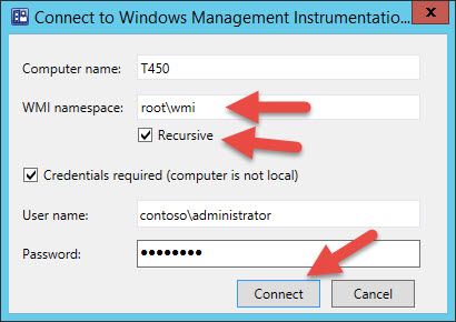 - If the system that is running the ConfigMgr Console is a Lenovo, leave the pre-populated computer name. Otherwise type the computer name of a Lenovo system that is current on the network. For the WMI namespace field, enter: root\wmi and check the Recursive box. Enter credentials if connecting to a remote system and click the Connect button.