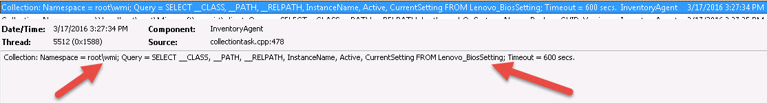 - On a targeted Lenovo system, kick off a Machine Policy Retrieval & Evaluation Cycle and then a Hardware Inventory Cycle. In the InventoryAgent.log on the client, you should find an entry being inventoried for the newly defined namespace.