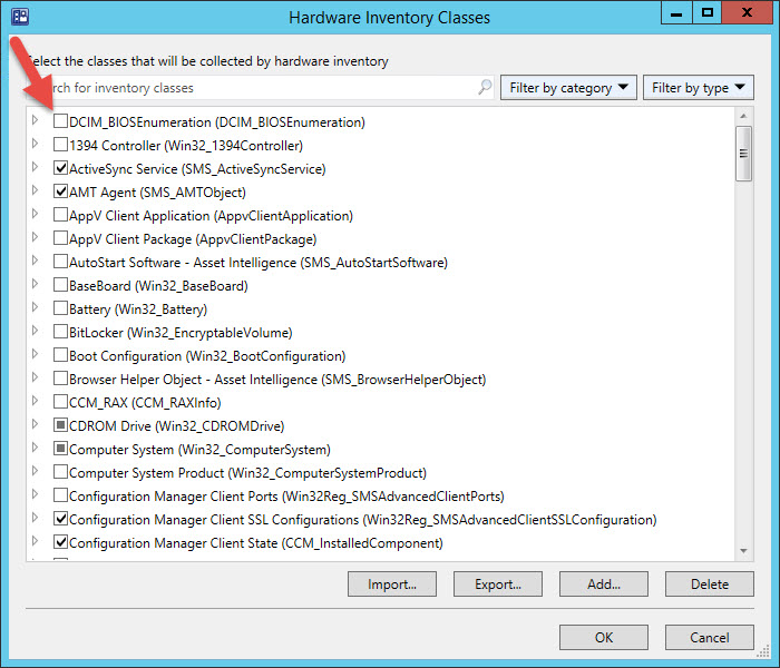 5. On the Add Hardware Inventory Class window, select the following class: DCIM_BIOSEnumeration and click OK. This enables us to inventory BIOS UEFI settings (current and possible).