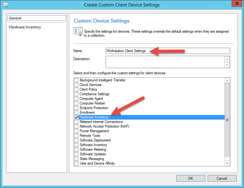 8. Next, create a Custom Client Device Settings, give it the name Workstation Client Settings, select Hardware Inventory (or use a previously created one).