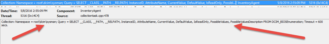 13. On a targeted Dell system, kick off a Machine Policy Retrieval & Evaluation Cycle and then a Hardware Inventory Cycle. In the InventoryAgent.log on the client, you should find an entry being inventoried for the newly defined namespace.