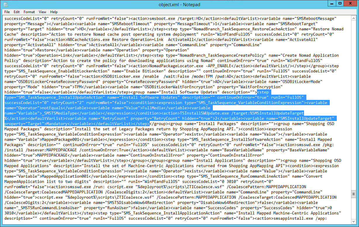 - Edit the object.xml file using Notepad (or your favorite editor). Look for the step that contains “SMS_TaskSequence_InstallUpdateAction” and delete everything between the opening <step> and closing </step> like highlighted in the screen shot below and then save the file. NOTE: You might need to run it as administrator depending on the location of your extracted files.