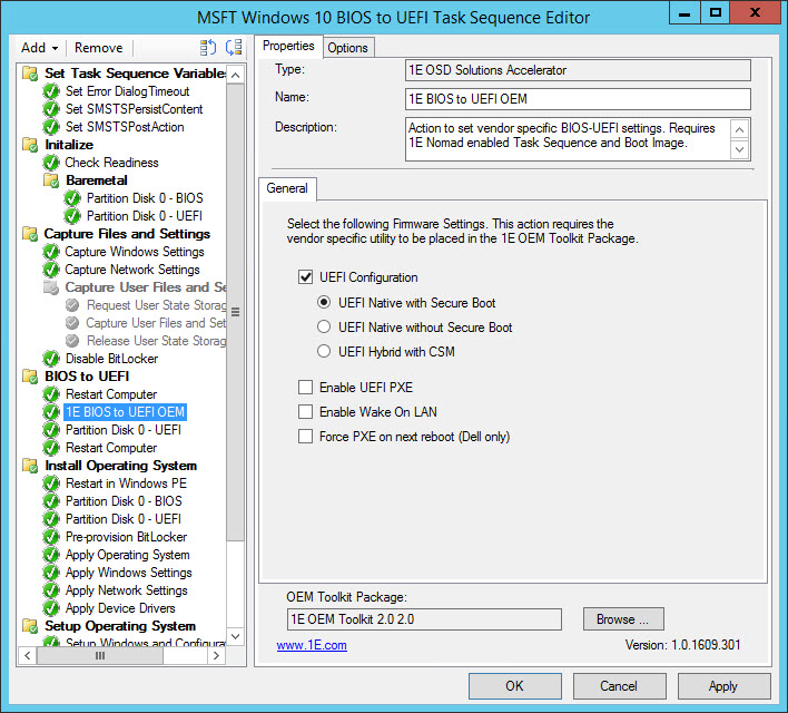 The other custom action is called 1E BIOS to UEFI OEM. This step is the one that everyone loves as it has buttons and check boxes that can be set. This step works on Dell, Lenovo and HP enterprise class systems.