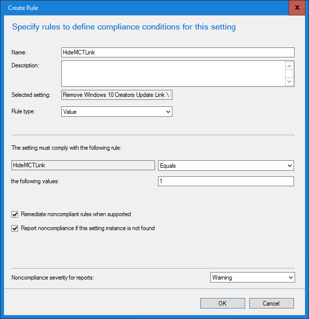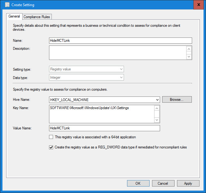 If our machines don’t get the value: HideMCTLink, I get a a non-compliance count. Is it possible to add the registry value without above option?
