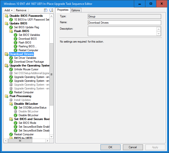 At the 2016 Midwest Management Summit, I had come up with a solution that covered most of the above requirements for doing the BIOS updates. At the time, I had split each of the vendors because it made it more modular, but also because some vendors (to remain nameless) at the time did not support flashing under WinPE x64. The only thing that I did not have figured out was how to do the dynamic content location request. In the Task Sequence below, I was cheating by creating a dummy group handle the CLR (the dummy group is one that does not execute but the TS does not know it and will still do the CLR at the start of the TS).