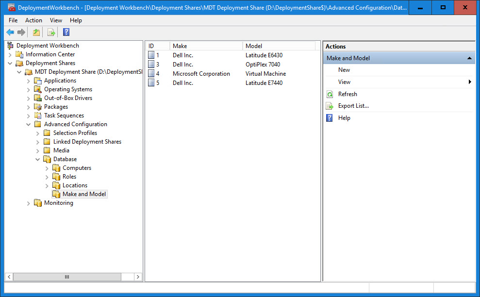 3. Define each make/model in the MDT database. I do not cover Lenovo systems in this blog, so if you manage those systems then check out The Deployment Bunny’s blog Modelalias User Exit for Microsoft Deployment Toolkit 2010/2012.