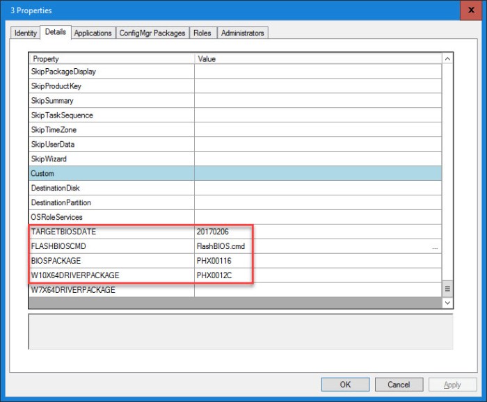 4. On the Details tab, scroll down to the bottom where the custom properties are listed and enter the Package IDs, Target BIOS Date and Flash BIOS command. The Target BIOS date is that that shows up in WMI for the BIOS version (also seen in msinfo32) in YYYYMMDD format.