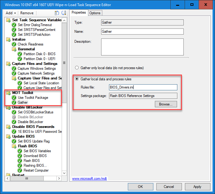 6. Create a MDT Gather step in the Task Sequence that uses the custom settings created above. This gather step will get the above entries that have been populated in the MDT database.