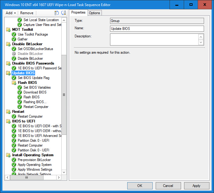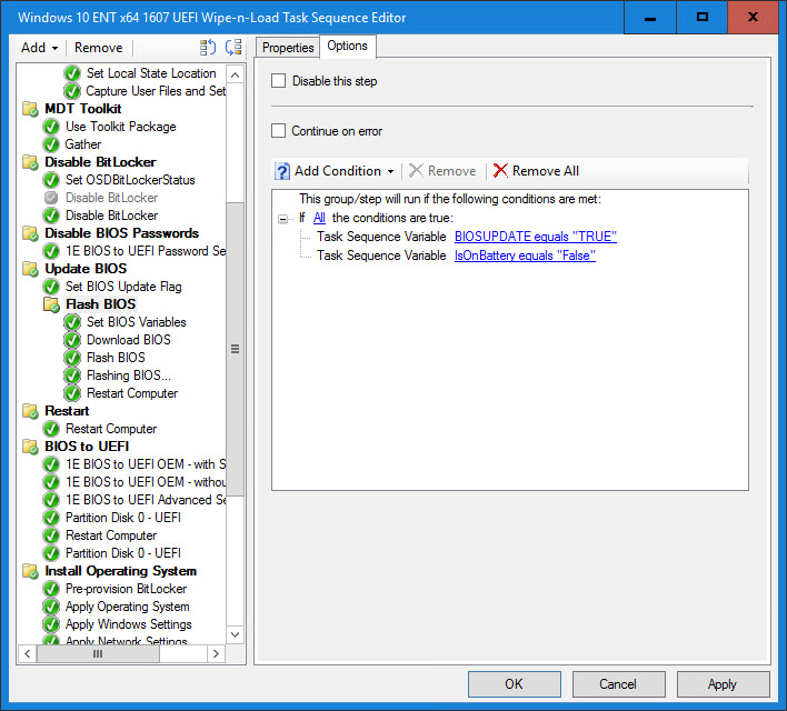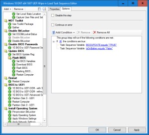 9. Create a Flash BIOS group. The conditions on this group are if BIOSUPDATE is TRUE and IsOnBattery is False. Since many BIOS update utilities require AC, we do not even want to try to update the BIOS if it is running on battery. The IsOnBattery variable is set by the MDT Gather step. It also should be checked as part of pre-flight checks, but by also keeping it in the Update BIOS group, we keep it modular and this group can be used in a Software Distribution Task Sequence to update the bios existing clients.