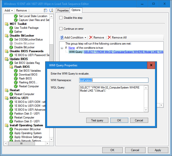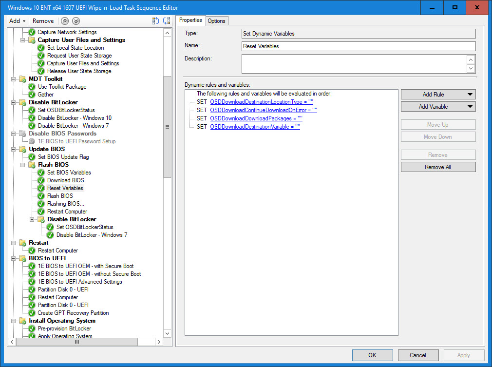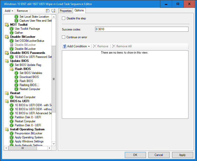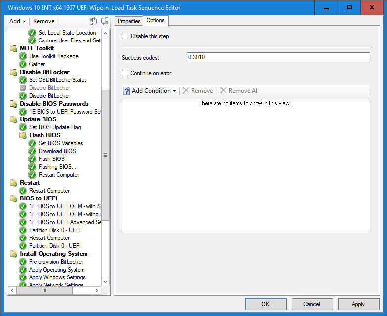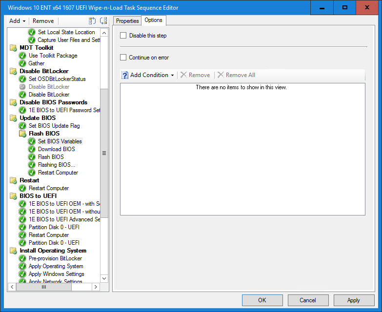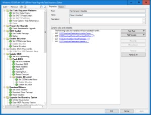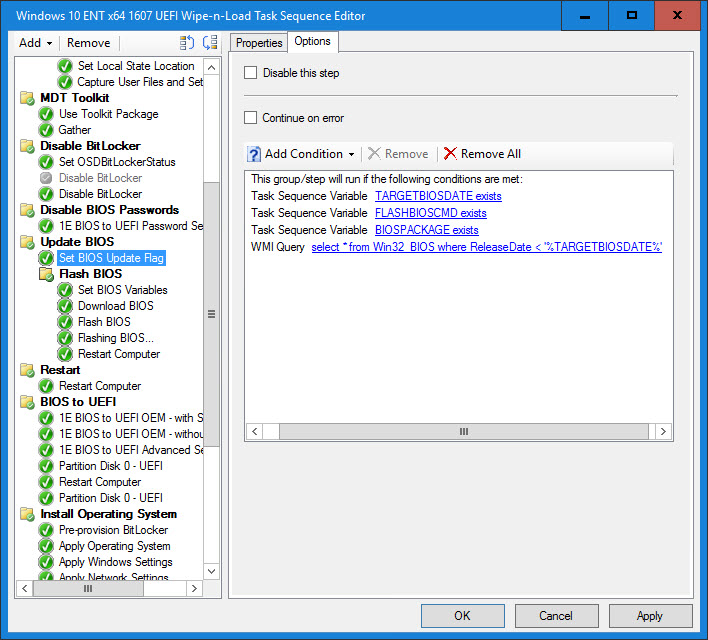 8. Set the BIOSUpdate Task Sequence variable. This variable will determine if a BIOS update is necessary based on the BIOS release date and also if TARGETBIOSDATE, FLASHBIOSCMD and BIOSPACKAGE exist.