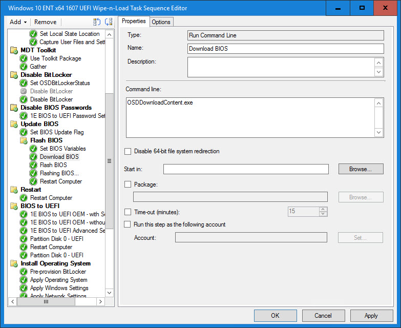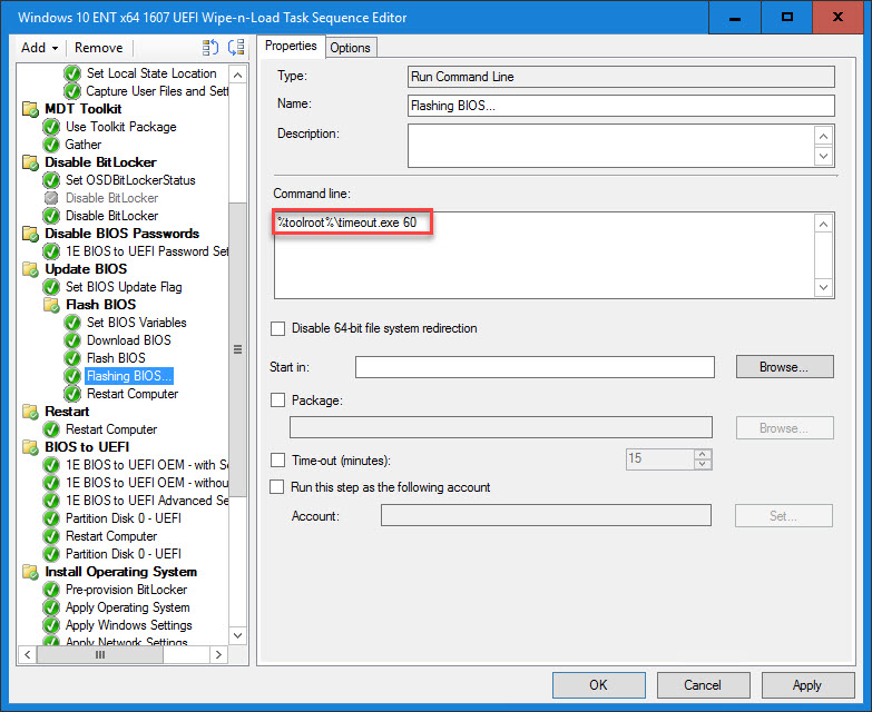 13. The Flashing BIOS… step is also another Run Command Line step that executes timeout.exe for 60 seconds. Timeout.exe is not part of the MDT Toolkit Package, so you will need to add the correct versions (x86/x64) to your MDT Toolkit Package if you want to use it. The Windows 10 version of timeout.exe will not run on Windows 7. However, the Windows 7 version of timeout.exe will run on Windows 10. The alternatively, simply include timeout.exe in the path on your Boot Images and then it will run regardless of the operating system. Otherwise, I have seen ping commands being used to create a sleep cycle. The reason I do this is because some vendors recommend not rebooting right away (even though the main process finished). Therefore, I stick it in there for good measure.