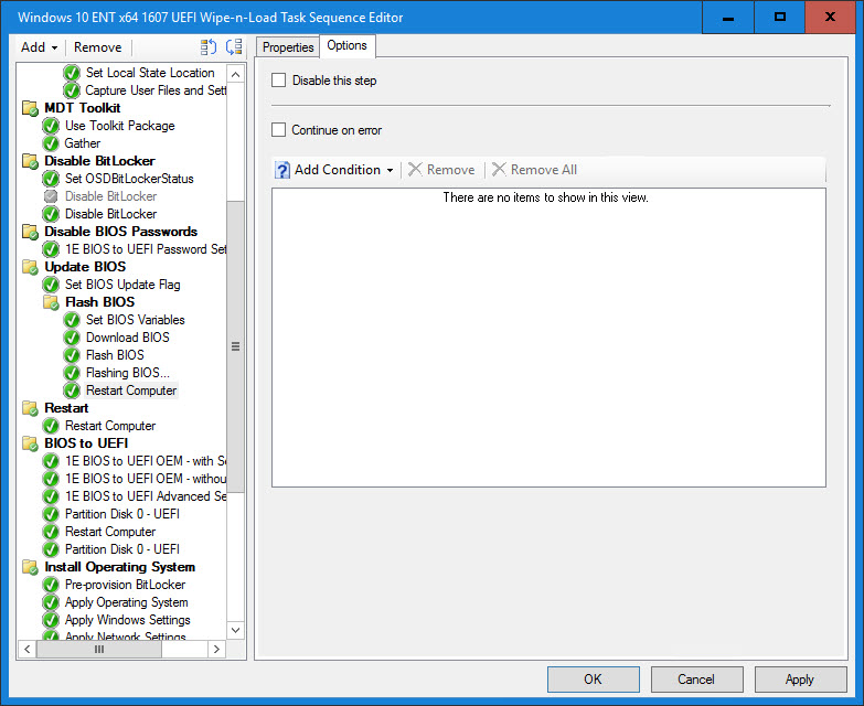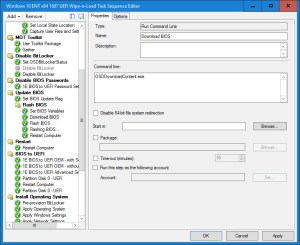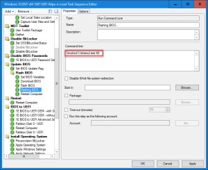 12. The Flash BIOS step is another Run Command Line step that executes the command stored in the FLASHBIOSCMD variable. It also sets the working directory to the location where the BIOS package was downloaded (BIOS01). Use Continue on error or define the exit return codes so the Task Sequence does not fail.