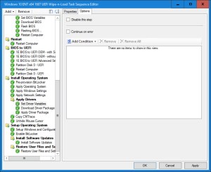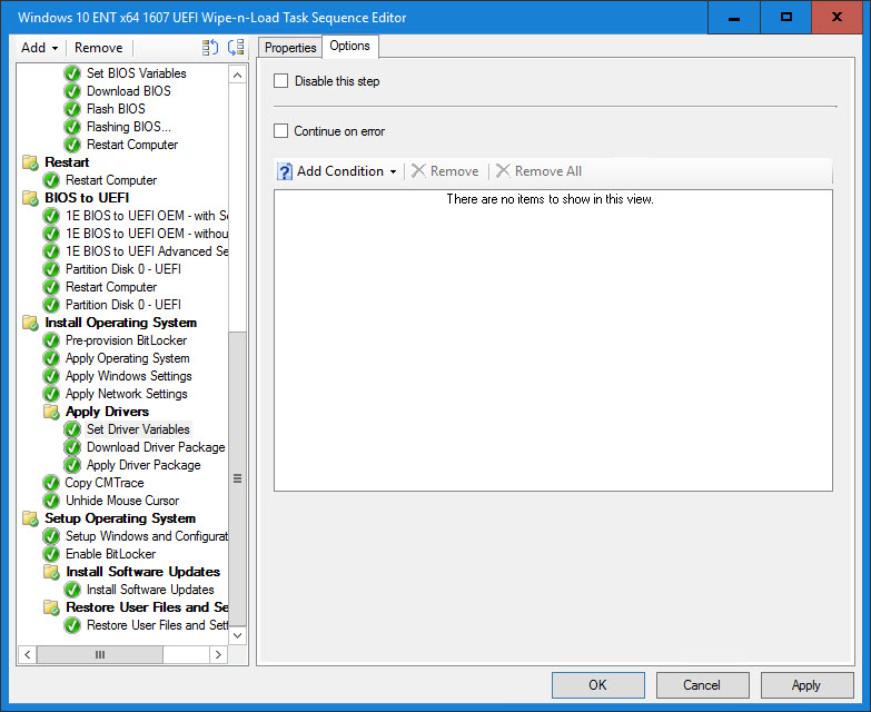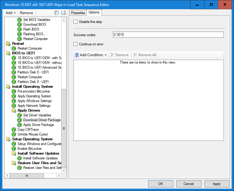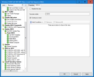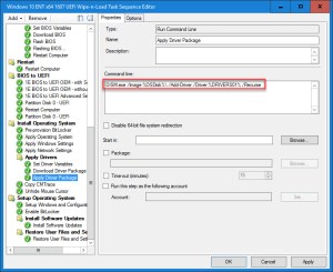 9. Continue on error, not a good idea. You will then miss when there’s a real driver failure. I have driver package that have over 30 drivers and I always end with exit code 0. If you got something else, check your drive package. If some are skip, remove them as it’s not needed and generate false positive. All my drivers work with dism, there’s no reason it shouldn’t. If you got error, check the driver package, something is missing. I’ve had that problem at first, all my driver where working fine using the good old install driver step, when I switched to DISM, oh now I’m getting failed. Everytime, it was because there was a missing file somewhere in one of the drivers, although I could install them directly in device manager, dism didn’t liked them. I manage to find every driver that had missing files, some where even bugged from the vendor itself.