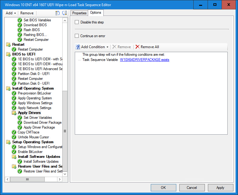 15. Directly below the Apply Network Settings step, create a new group called Apply Drivers. The condition on this group is if W10X64DRIVERPACKAGE exists. If the variable does not exist, then it was not populated in the MDT db and this group will be skipped. This is by design for the scenario where a model does not have a Windows 10 Driver Package and/or the out of the box Windows 10 drivers work just fine.