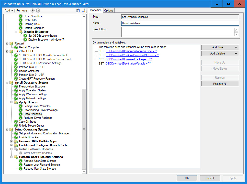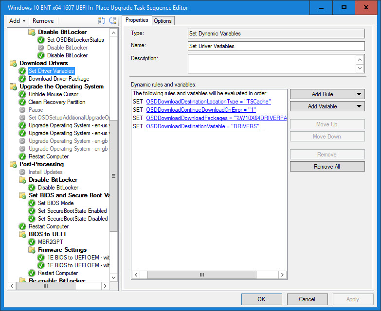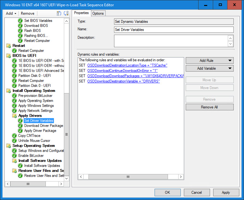 16. Set Driver Variables (similar to the Set BIOS Variables) is where part of the magic happens and is a Set Dynamic Variables Task Sequence step. This is where we also set the following variables: OSDDownloadDestinationLocationType, OSDDownloadContinueDownloadOnError, OSDDownloadDownloadPackages and OSDDownloadDestinationVariable. Here, we are downloading the package found in the W10X64DRIVERPACKAGE variable and we are going to store the download location in a base variable called DRIVERS. Since there is only one package, the location will get stored in the variable DRIVERS01.