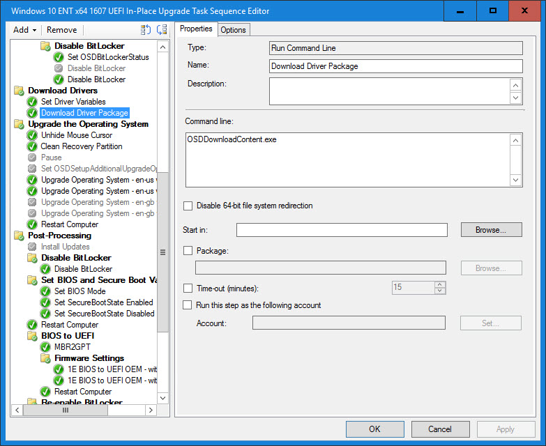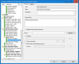 17. The Download Driver Package step is a Run Command Line step that calls OSDDownloadContent.exe. This exe is tied to the Download Package Content Task Sequence step and will consume and use the variables set in the previous step. This step is also part of the magic as it will do a dynamic content location request for the package and then download it to the TS Cache.