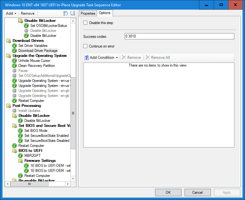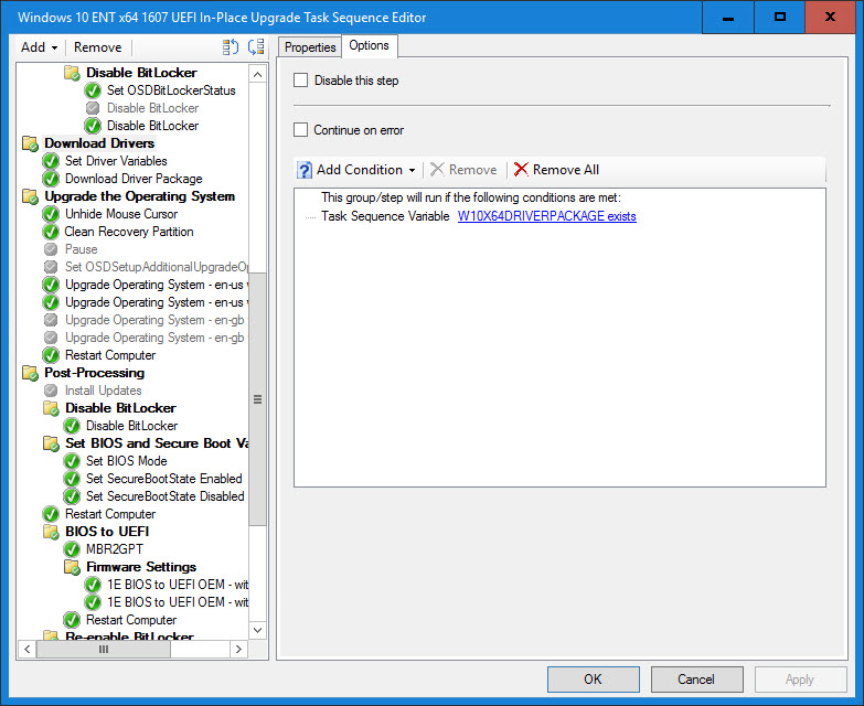 24. In the case that the Driver Package does not exist, duplicate the previous step, clear the “Provide the following driver content to Windows Setup during upgrade” option and add the condition Task Sequence Variable DRIVERS01 not exists. This can be reduced to using one step by using the undocumented variable OSDUpgradeStagedContent variable that Johan Arwidmark talks about in his blog post Improving the ConfigMgr Inplace-Upgrade Task Sequence.