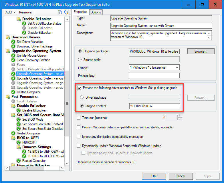 23. Now we need to inform the Update Operating System step the location of the drivers. Enable the “Provide the following driver content to Windows Setup during upgrade” option and enter %DRIVERS01% for the “Staged content” location. Since we only want this to run when the Driver Package exists, add the condition Task Sequence Variable DRIVERS01 exists.