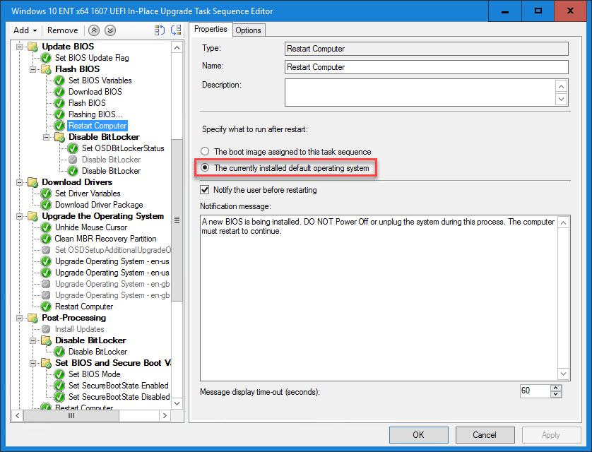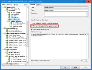 19. After the Flashing BIOS… step, change the Restart Computer step to restart to the currently installed default operating system. Provide the end user a message like “A new BIOS is being installed. DO NOT Power Off or unplug the system during this process. The computer must restart to continue.” NOTE: After the reboot, if using BitLocker on Windows 7, you will need to disable/suspend it again since the built-in Configuration Manager step only suspends it for one reboot.
