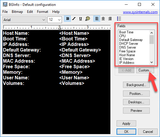First things first, you want to be sure that you download the latest version of BGInfo that works with Windows 10 (at the time of this writing, the latest version is 4.25). Running BGInfo, we see that there are a few built in fields that we can use (but not what we are looking to add) and also a Custom button: