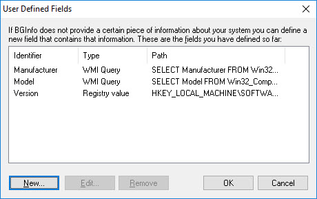 Place both scripts where BGInfo can access them when it is run (I use C:\Program Files\BGInfo\) and create a new custom user defined field for each (BIOS Mode and Secure Boot). Once done the User Defined Fields will look like the following: