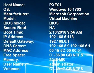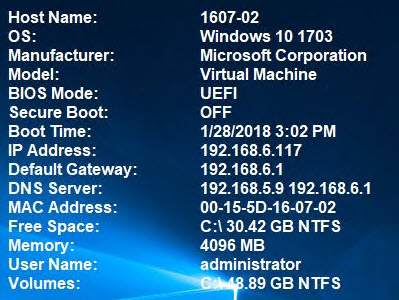 Recently, my team has been doing a lot of testing for our next big Windows 10 In-place Upgrade. We are designing and developing a new process that I call Windows as a Service in the Enterprise (and we plan on sharing this at MMSMOA in May). As part of our testing, we need to test both physical systems and virtual, both legacy BIOS and UEFI. Since the days seem to run together, often times I find myself wondering not only what system I am looking at, but what OS it is currently running and how it is configured. Sure this is easy to find from System Information, but typing msinfo32 gets old. Having used BGInfo in the past, I thought this would be a perfect solution to just display this information on the desktop.