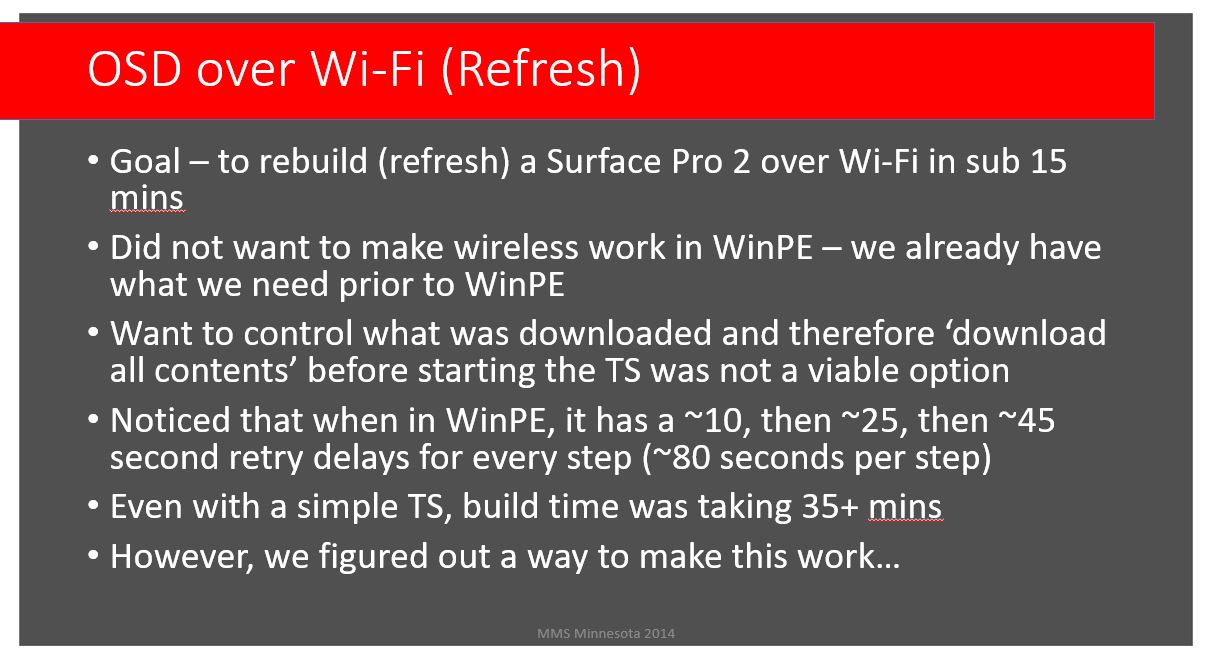 Back in my MMSMOA session Hacking the Task Sequence 2014, I presented on what at the time was a unique situation – speeding up Task Sequences that were running in disconnected states. Earlier that year, I was creating a demo on how to OSD (Wipe-and-load) over Wi-Fi, only I ran into a problem in the fact it was taking way too long. This was a simple Task Sequence for a Surface Pro 2 and my goal was to get it down to sub 15 minutes. However, even the simple Task Sequence was taking 35+ minutes. No one is going to sit around watching this demo for that long so I need to figure out why it was taking so long.