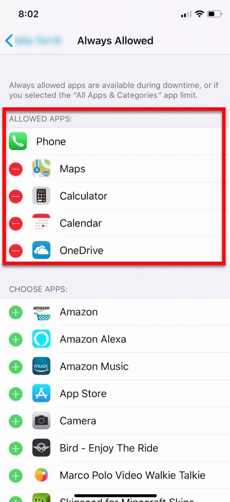 Here is where you select what Apps can be used during Downtime. If I recall correctly, iMessage and FaceTime were both allowed by default when I initially configured this for my kids (two apps that I do not want them using during Downtime). Add in the apps that you want them to be able to use (Phone cannot be removed). Here I have Maps, Calculator, Calendar and OneDrive as allowed apps: