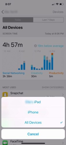 This will also report on all devices combined or you can select a report per device if your kid has multiple iOS devices: