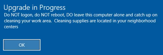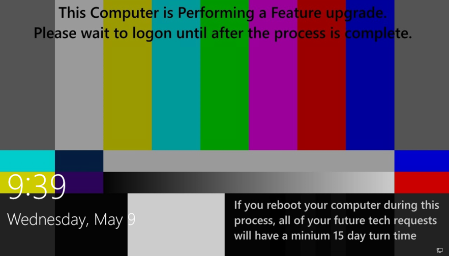 Another thing that was done to make sure users knew an upgrade was in process was we customized the lock and logon screens. We thought about actually preventing users from logging in but instead we just warned them that an upgrade was in process. Depending on what step the Task Sequence is running, the progress notification may have already happened prior to log on and if it is in the middle of the OS Upgrade step, an end user logging on will not see the progress UI. So this helps prevent issues of that happening.
