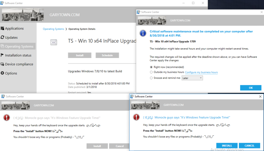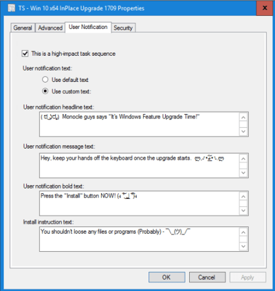 We decided to go with the built in notifications and instantly found some bugs and limitations. For some of our devices and lines of business, there should be no pop up notifications. The upgrade should just run off hours without any notification or user involvement. For some of our other devices and lines of business we wanted pop up notifications and reminders so that they would have the ability to opt-in to the upgrade before the deadline. The challenge here is that notifications are enabled on the Task Sequence. Having to duplicate the Task Sequences seemed a bit crazy. So we used a little local policy trick and enabled notifications on only those devices that should get notifications. This was covered at MMSMOA in the Windows 10 OS Deployment – MVP Showcase session. It is on the list of WaaS items to be blogged, so stay tuned on how we do this…
