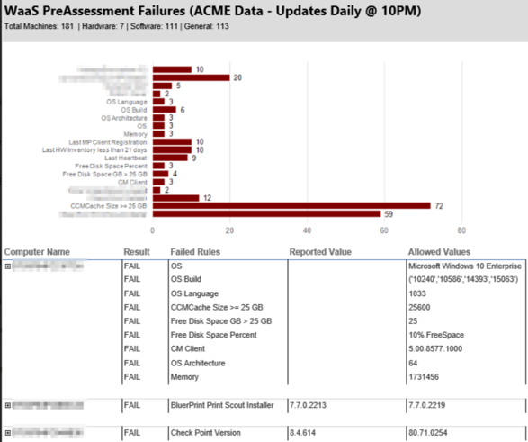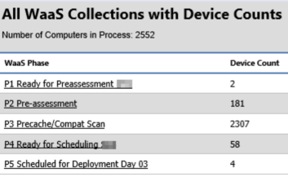 We built from scratch reports for Pre-assessment and In-place Upgrades and also modified some existing reports as well to only show data for machines currently in the WaaS process. I am sure that we will be blogging about some of these in the future and we are also hoping to get more Power BI style dashboards for daily status.