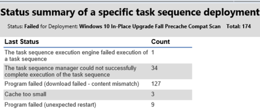 There is always a need for troubleshooting. For most of our unexplained errors, I blame them on our 3rd party security software. These are extremely difficult to pinpoint and show the actual cause. Microsoft recommends removing 3rd party anti-virus/anti-malware if you are having issues with upgrades. However, we structured things so that each phase could use various reports, status messages, and log files to help find the issue at hand. For certain failures, logs were automatically zipped up and copied to a log share so they could be further analyzed. After we figured out how to incorporate the Dynamic Updates into the OS Upgrade Package, systems that were not upgrading previously, upgraded without any issues. Unfortunately, we did not figure out how to do this until the tail end of our upgrade. Gary has a blog on it called IPU & Offline Dynamic Updates. Special mention to Adam Gross (http://www.asquaredozen.com/), David Segura (https://www.osdeploy.com/), and Marc Graham (https://blog.ctglobalservices.com/author/mag/) – as we have tested this over and over until we finally got it to work. Follow them on Twitter and read their blogs as they have some nice scripts and solutions for building and optimizing install.wim files and OS Upgrade Packages.