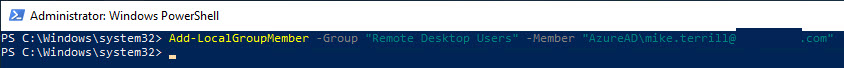 Add-LocalGroupMember -Group “Remote Desktop Users” -Member “AzureAD\mike.terrill@domain.com”