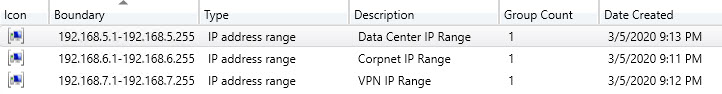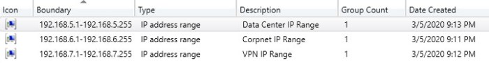 This is hopefully going to be a simple example to get you up and running (plus I can’t really show our production environment, so don’t ask). IP Ranges are your friend. Ever since the CM Team optimized the queries for client location requests, big honking IP Ranges are the way to go. Forget IP Subnets and AD Sites (unless you really like to cause yourself pain). So think big, like 0.0.0.0 – 255.255.255.255. However for this example I am going to keep it simple. The following are my three ranges:
