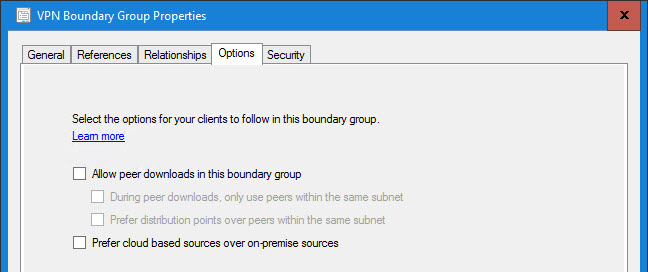• So it really depends on what you are after. If you do not mind that some clients might come back via the VPN to get patches in the event that they cannot get them from MU for some reason, then there is the option to set “Prefer cloud based sources over on-premise sources” on the Options tab of the Boundary Group Properties. For the intent of my post, I wanted to always have VPN clients use the cloud sources. Unfortunately there isn’t an option to ‘Only use cloud based sources over on-premise sources’.