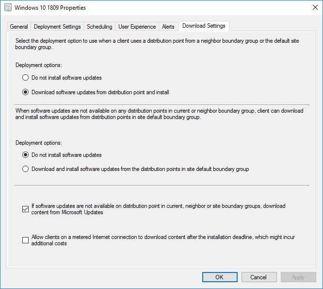 • Yes – good catch! That top option on the Download Settings tab should be “Download software updates from distribution point and install”. I will get that screen shot corrected – thanks!