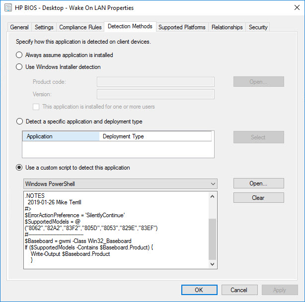 As mentioned above, I like configuring BIOS settings using CIs. When creating a CI that may or may not be applicable to other systems, it is a good idea to create an Application type CI (instead of an Operating System type CI). This way detection logic can be applied to see if the CI should or should not be evaluated on a system. For BIOS settings, I like to limit my CIs to the hardware models that I have certified and tested that it actually works. For HP models, I use the Win32_Baseboard Product identifier. The custom script for the HP desktop detection logic is the following: