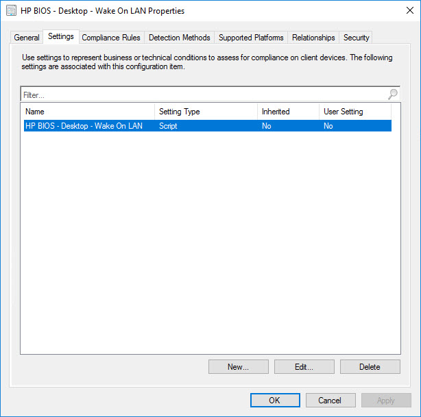 For configuring the HP desktop WoL settings, I will be using Configuration Manager Configuration Items (CIs) that are deployed via a Configuration Baseline. CIs can not only be used to report on settings, they can also be used to enforce settings and manage drift. Unlike GPOs, reporting is natively built in to Configuration Manager, which makes compliance reporting really easy.