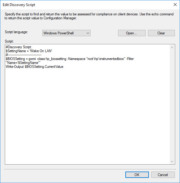 I also like to keep the Discovery Script modular so that it is easy to re-use for multiple BIOS settings. By keeping the Setting name at the top of the script, that is the only thing that needs to be changed for creating Discovery Scripts for other BIOS settings. For HP Desktop WoL the discovery script would be the following: