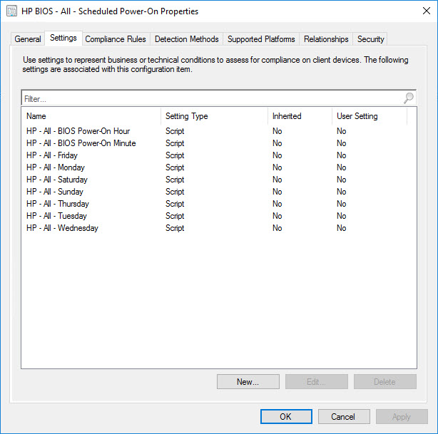 The other settings, S5 Maximum Power Savings and After Power Loss, follow the same approach. For the daily Power-On, I combine each setting in the same CI and it will look like the following: