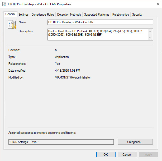 I also like to use categories for easy searching/filtering and use “BIOS Settings” and “WoL” for this CI. The CI General tab looks like the following: