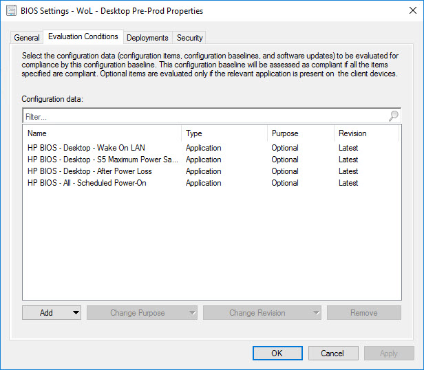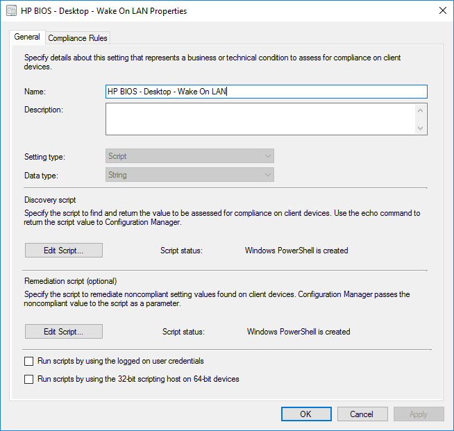 For configuring the HP desktop WoL settings, I will be using Configuration Manager Configuration Items (CIs) that are deployed via a Configuration Baseline. CIs can not only be used to report on settings, they can also be used to enforce settings and manage drift. Unlike GPOs, reporting is natively built in to Configuration Manager, which makes compliance reporting really easy.
