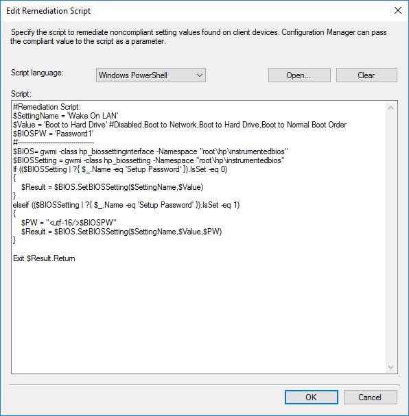 Like the modular Discovery Script, I also like to keep the Remediation Script modular so that it is easy to re-use for multiple BIOS settings. By keeping the Setting name, setting value and BIOS password at the top of the script, that is the only thing that needs to be changed for creating Remediation Scripts for other BIOS settings. For HP Desktop WoL the remediation script would be the following: