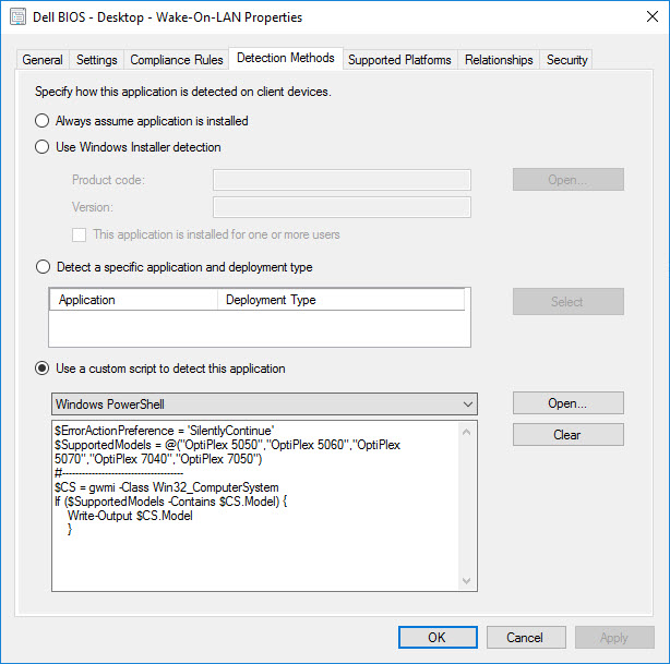 As mentioned above, I like configuring BIOS settings using CIs. When creating a CI that may or may not be applicable to other systems, it is a good idea to create an Application type CI (instead of an Operating System type CI). This way detection logic can be applied to see if the CI should or should not be evaluated on a system. For BIOS settings, I like to limit my CIs to the hardware models that I have certified and tested that it actually works. For Dell models, I use the Win32_ComputerSystem Model identifier. The custom script for the Dell desktop detection logic is the following: