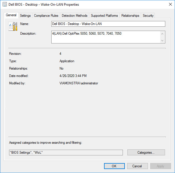 I also like to use categories for easy searching/filtering and use “BIOS Settings” and “WoL” for this CI. The CI General tab looks like the following: