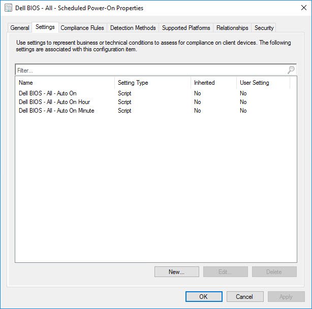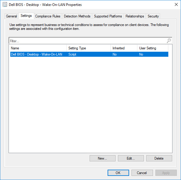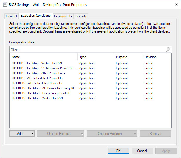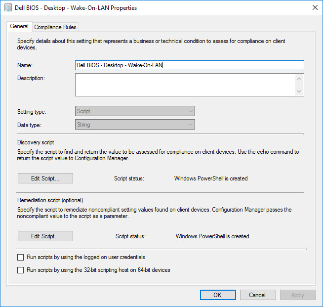 For configuring the Dell desktop WoL settings, I will be using Configuration Manager Configuration Items (CIs) that are deployed via a Configuration Baseline. CIs can not only be used to report on settings, they can also be used to enforce settings and manage drift. Unlike GPOs, reporting is natively built in to Configuration Manager, which makes compliance reporting really easy.